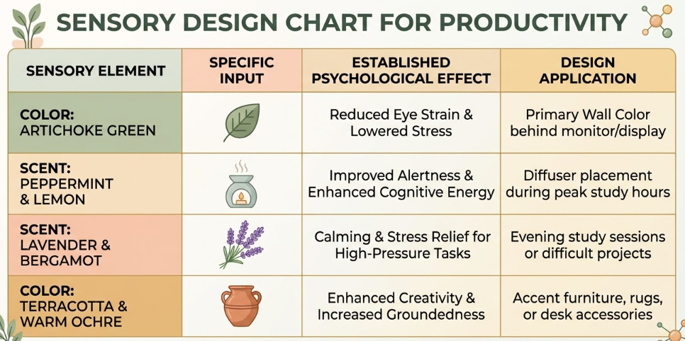 To truly boost your mood, you need to lean into color psychology. While bright red might be too overstimulating for a study area, Artichoke Green and Terracotta are trending because they ground the space in earthy, organic tones. Green is known to reduce eye strain, making it the perfect choice for a feature wall behind your computer monitor.